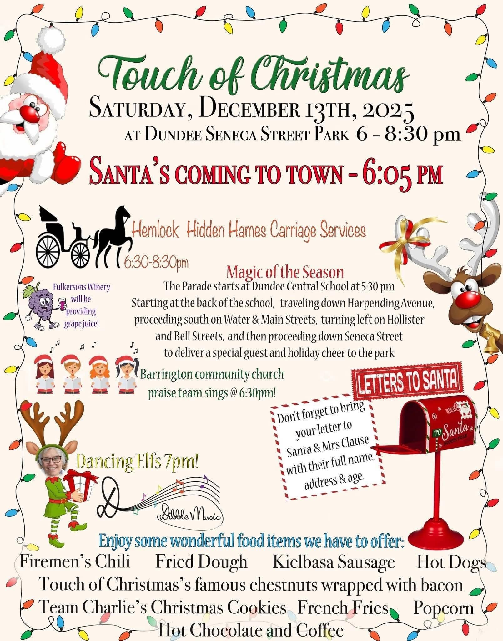On Saturday, December 13th, 2025, Dundee Seneca Street Park will twinkle a little brighter as the village gathers for one of its most beloved traditions — Touch of Christmas. From 6:00 to 8:30 pm, the park becomes a holiday haven filled with music, laughter, dancing elves, warm treats, and that unforgettable feeling of community joy that only small towns know how to create.