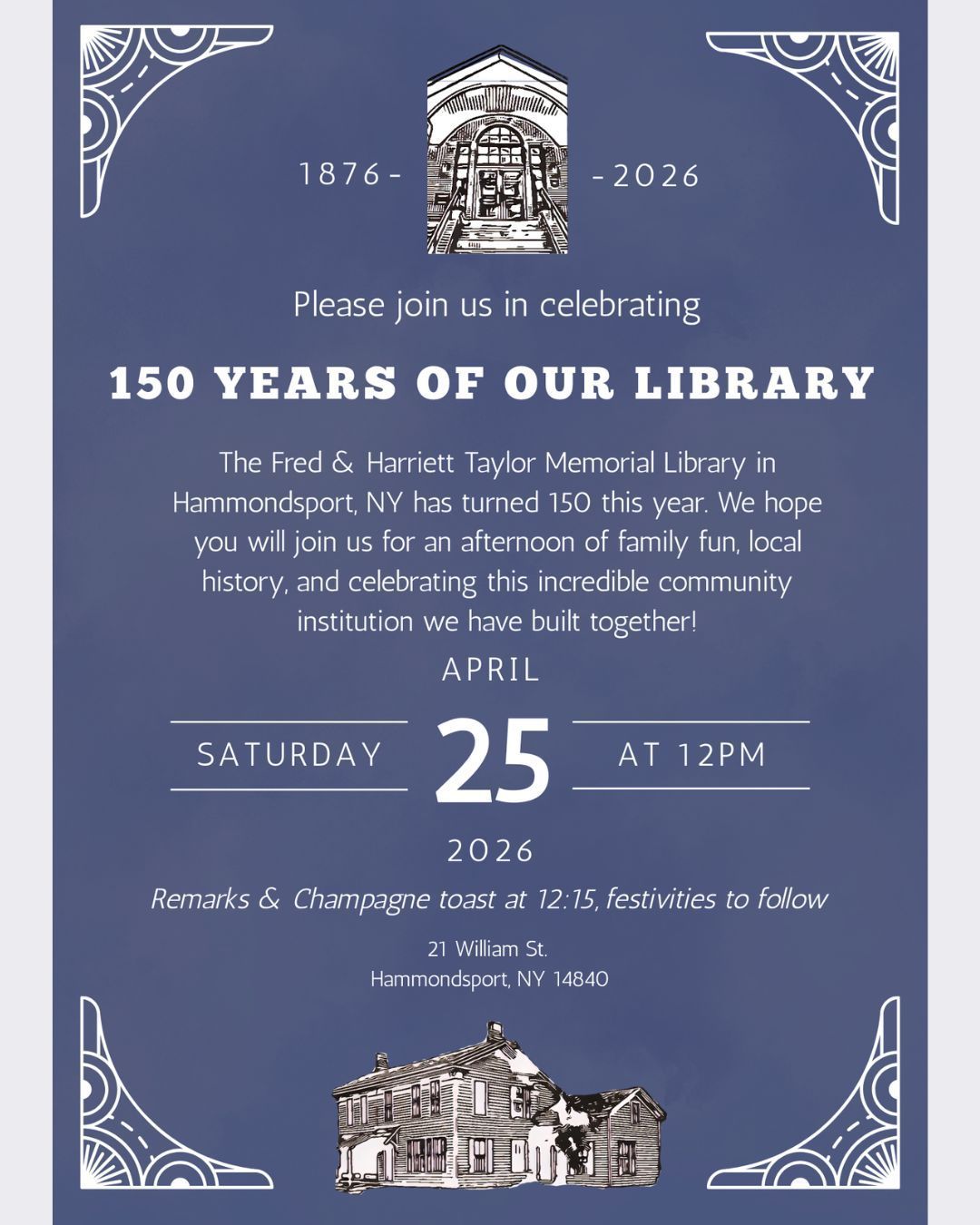 On Saturday, April 25th from 12:00 – 2:00 PM, the Fred & Harriett Taylor Memorial Library will host a 150th Anniversary Community Celebration, welcoming neighbors, families, and friends to gather both indoors and outdoors for an afternoon that reflects the heart of the library itself — learning, laughter, and community.