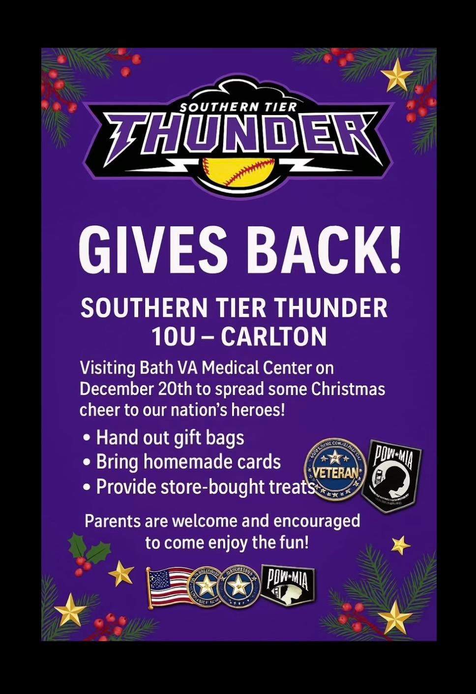 On December 20th, the Southern Tier Thunder 10U traveling softball team will bring holiday joy to the Bath VA — delivering gifts, smiles, and heartfelt gratitude to the veterans who have served our nation.