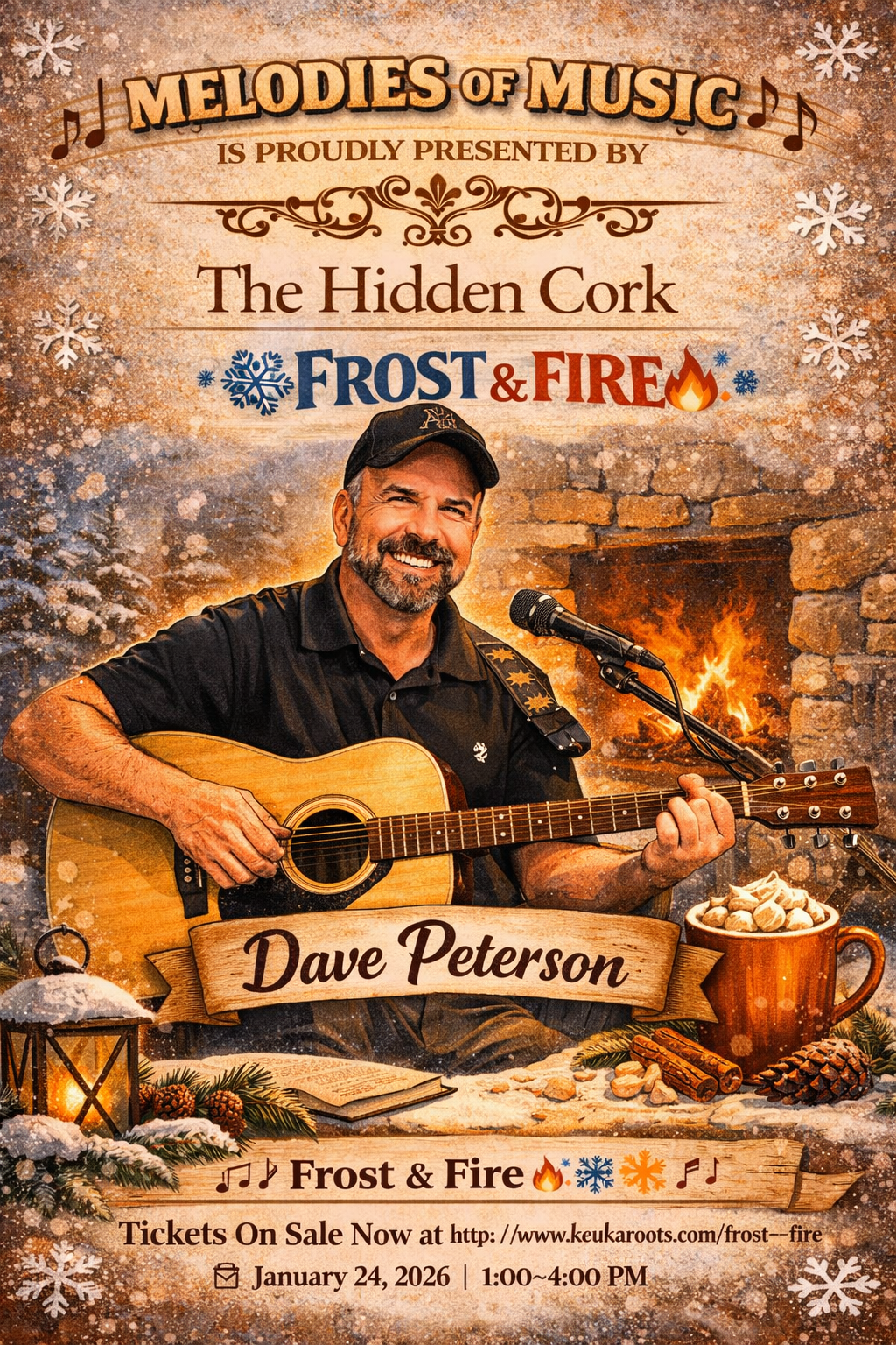 Let the warmth of winter carry on the sound of music. Melodies of Music comes to Frost & Fire with the rich, acoustic stylings of Dave Peterson, filling the space with soulful melodies and easy-listening rhythms.