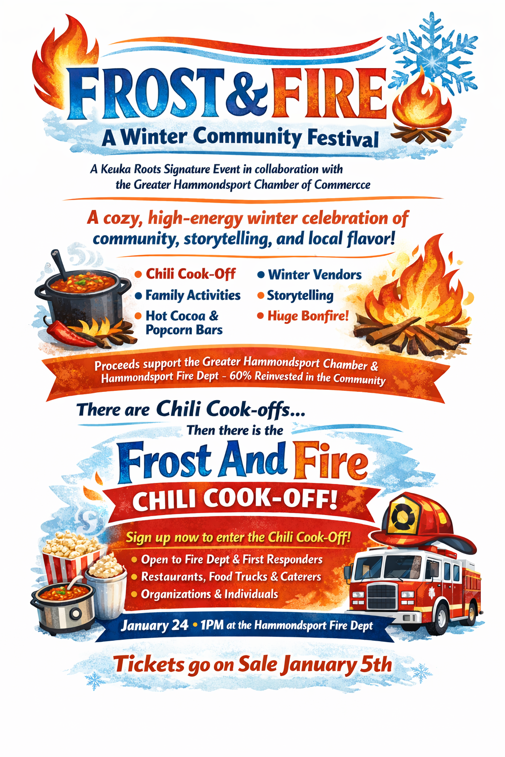 Keuka Roots, in collaboration with the Greater Hammondsport Chamber of Commerce, proudly presents Frost & Fire—a winter community festival celebrating warmth, connection, and small-town magic at the heart of the season.