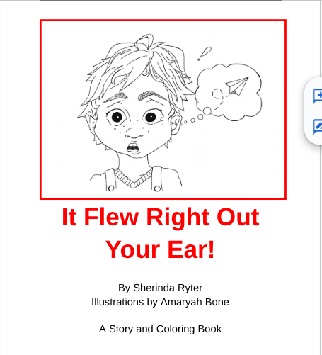 "It Flew Right Out Your Ear" is the tale of how a young child figured out the best way to keep thoughts from flying out the ear! Told in verse with predictive text, this book is perfect as a 'read to me' book, especially for young ones just showing an interest in reading. The story's illustrations are gender and race neutral, so readers are encouraged to color the book to fit them best!