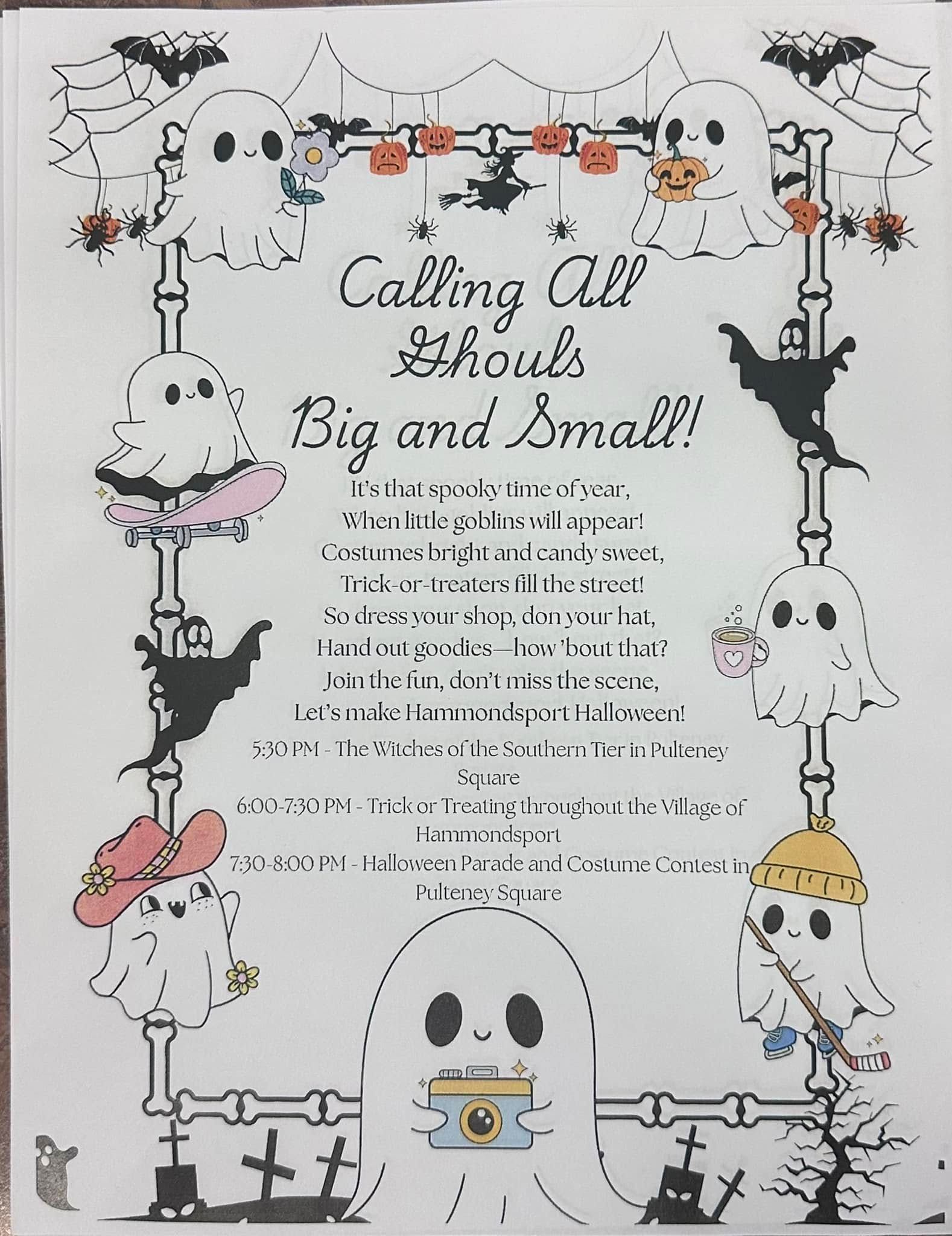 TONIGHT!!! Don’t miss out on all the Halloween festivities in the Village! The fun kicks off at 5:30 PM when the Witches of the Southern Tier sweep into the Square with their annual performance — a local favorite full of sparkle, laughter, and a touch of spooky charm.