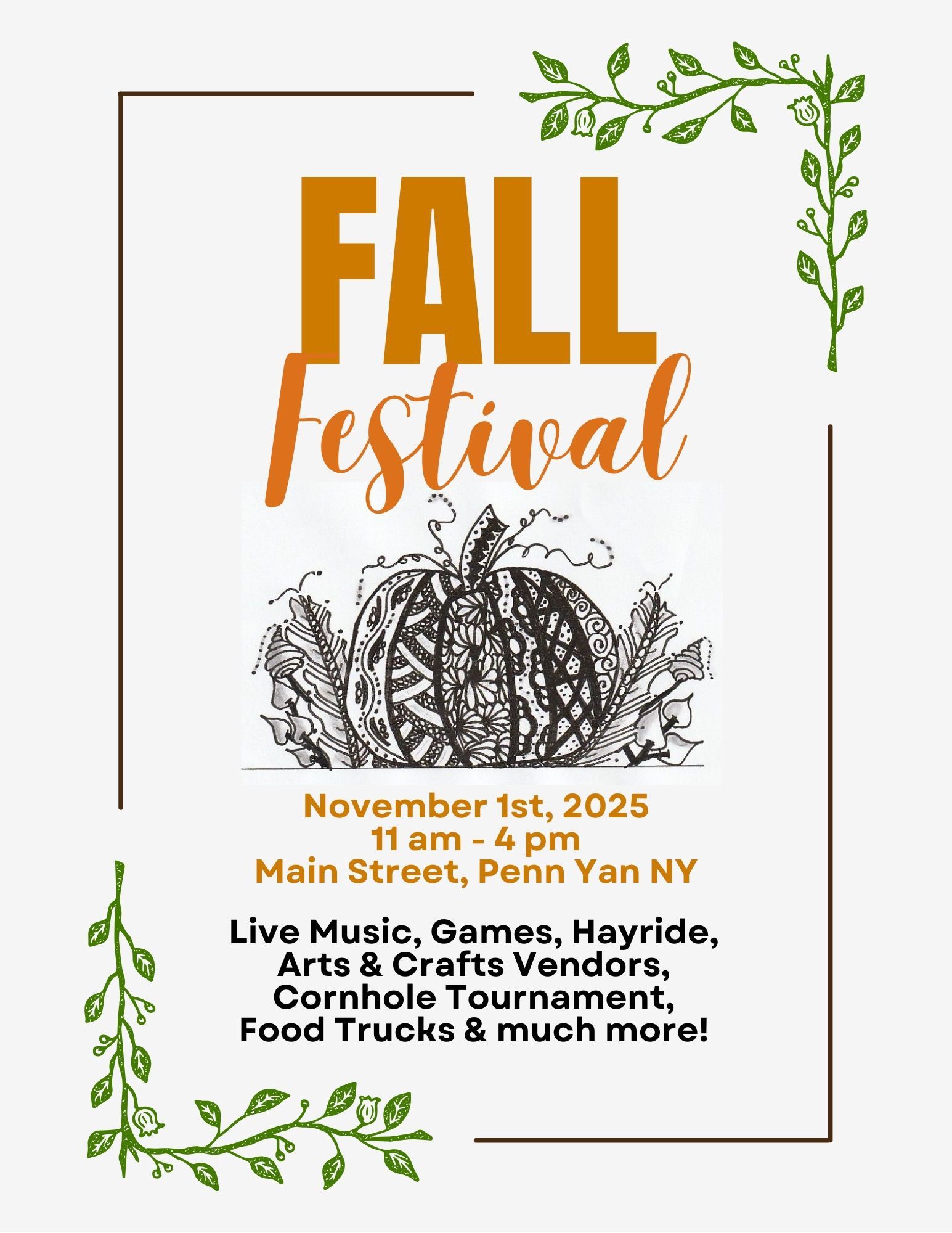 After a successful first year of focused growth in 2024, the Downtown Business Council of Penn Yan (DBC) is thrilled to bring back the Fall Festival even bigger and better for 2025! This year’s celebration features an additional live band, a brand-new beer tent, more food options, and 15 extra arts, crafts, and non-profit booths—all designed to make this cherished community event the best one yet.